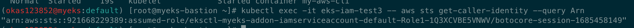 kubectl exec -it eks-iam-test3 -- aws sts get-caller-identity --query Arn