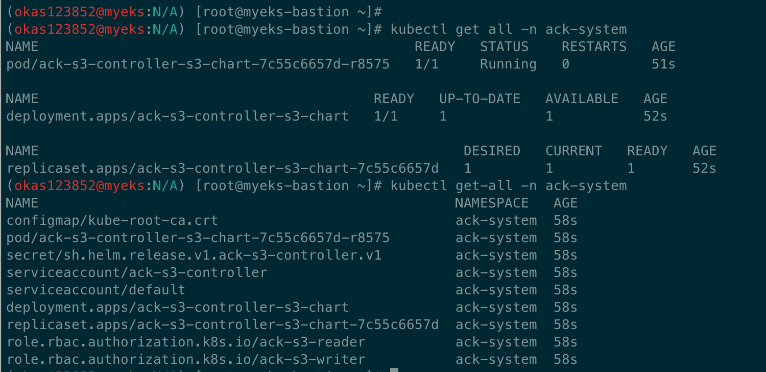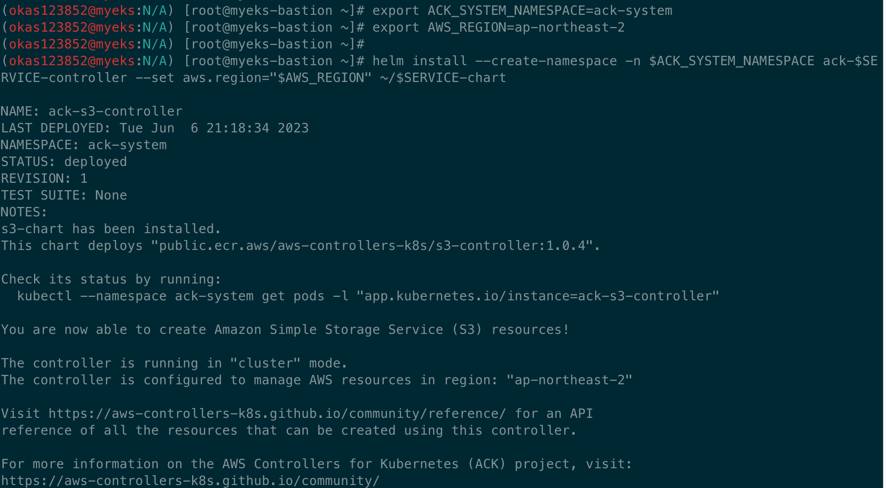 helm install --create-namespace -n $ACK_SYSTEM_NAMESPACE ack-$SERVICE-controller --set aws.region="$AWS_REGION" ~/$SERVICE-chart