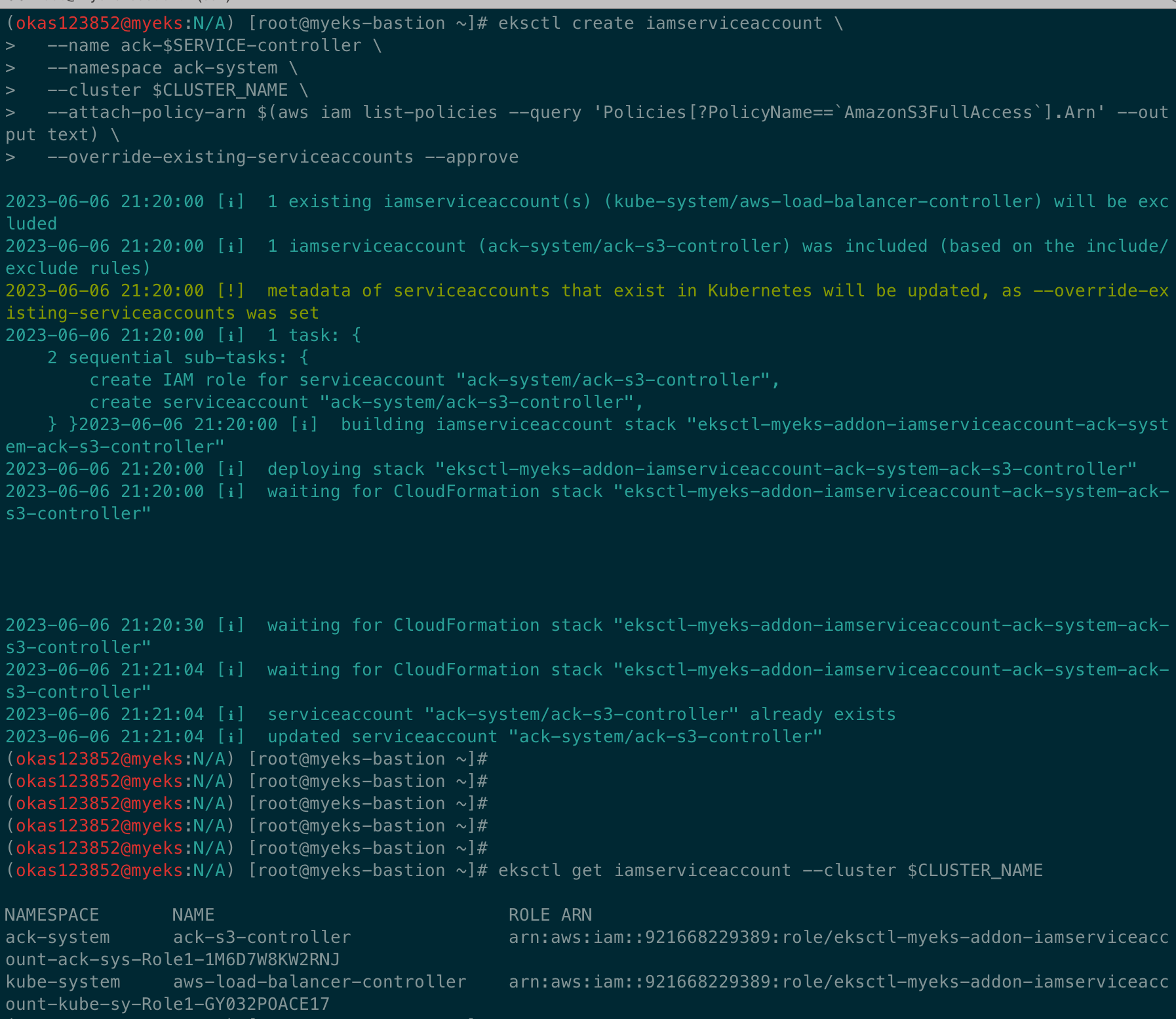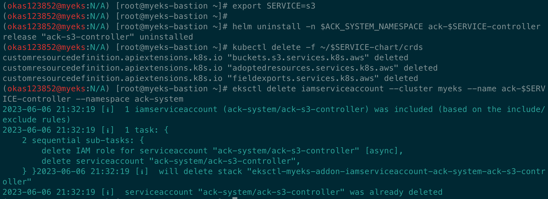 eksctl delete iamserviceaccount --cluster myeks --name ack-$SERVICE-controller --namespace ack-system