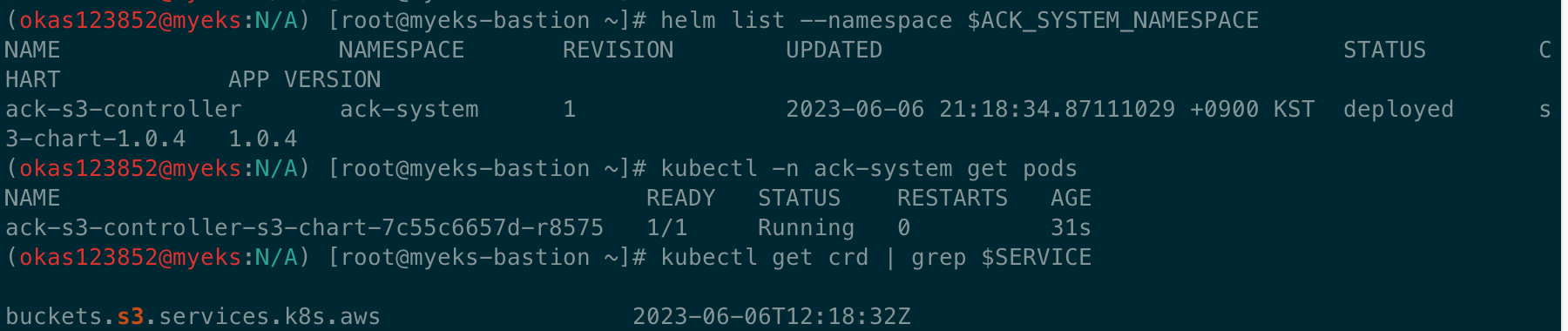 실습 순서는 ACK Controller 설치 / IRSA 설정 / S3 생성, 삭제 입니다.