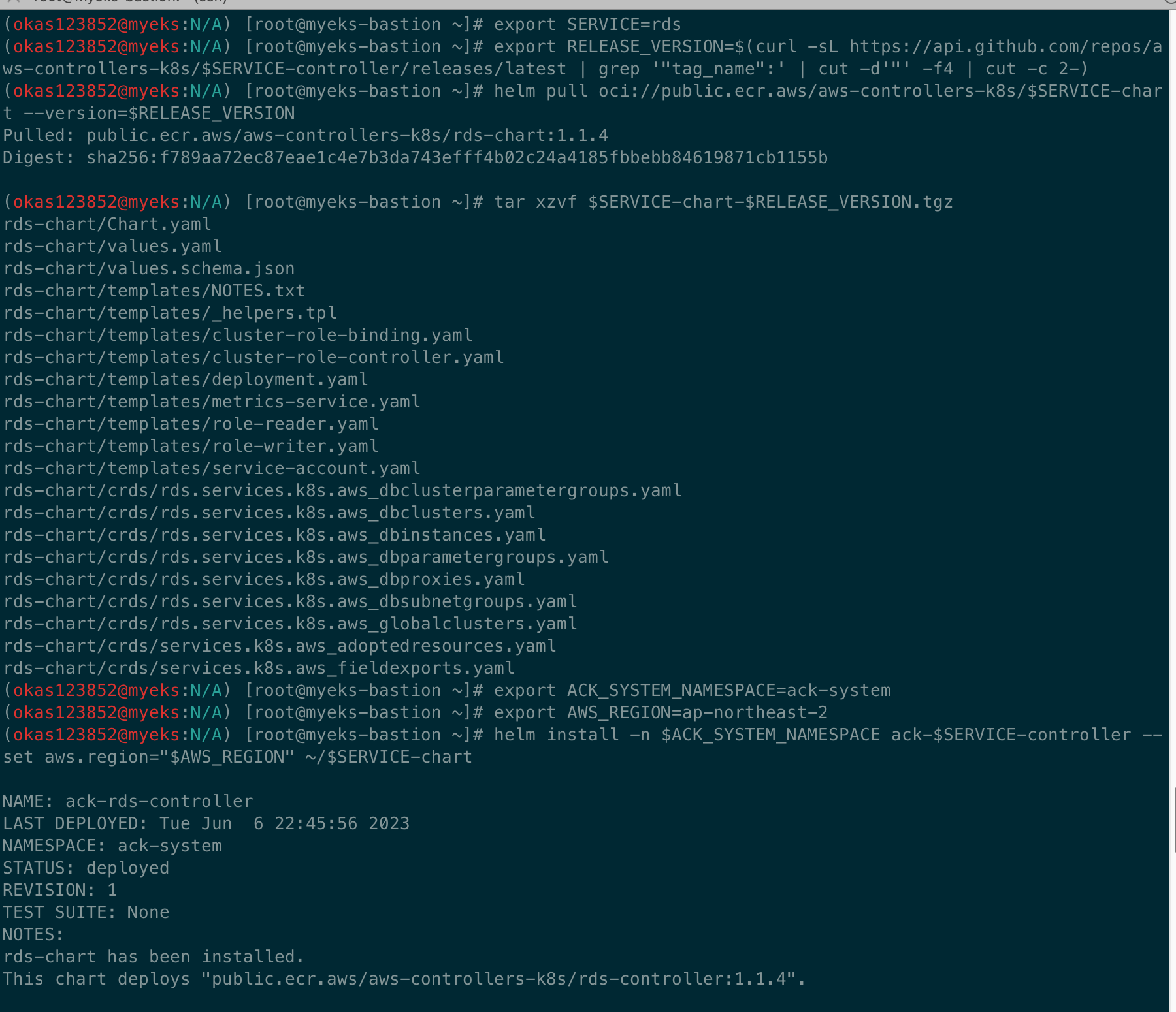 helm install -n $ACK_SYSTEM_NAMESPACE ack-$SERVICE-controller --set aws.region="$AWS_REGION" ~/$SERVICE-chart