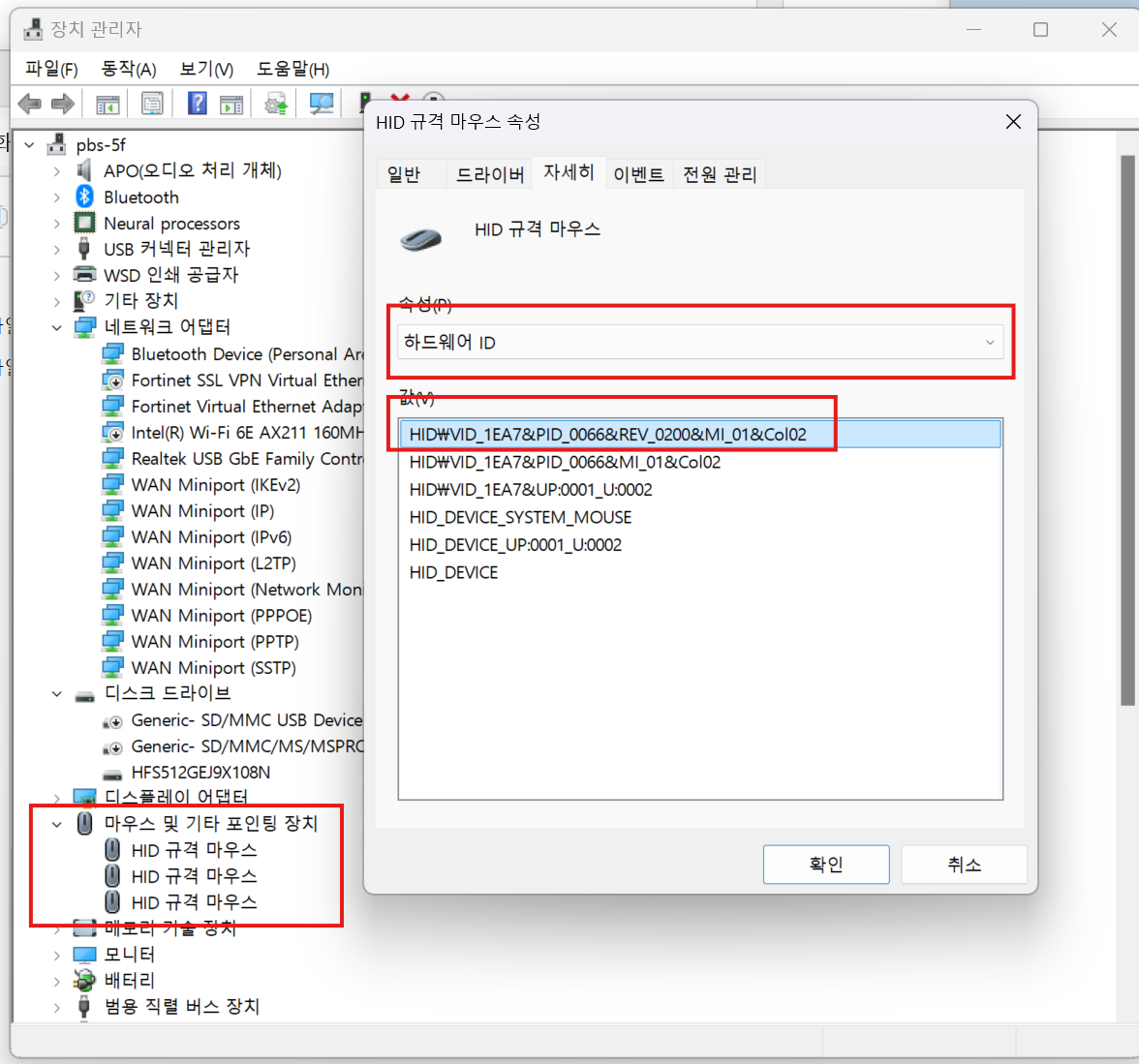 1. 장치 관리자에서 마우스 하드웨어 아이디 찾기